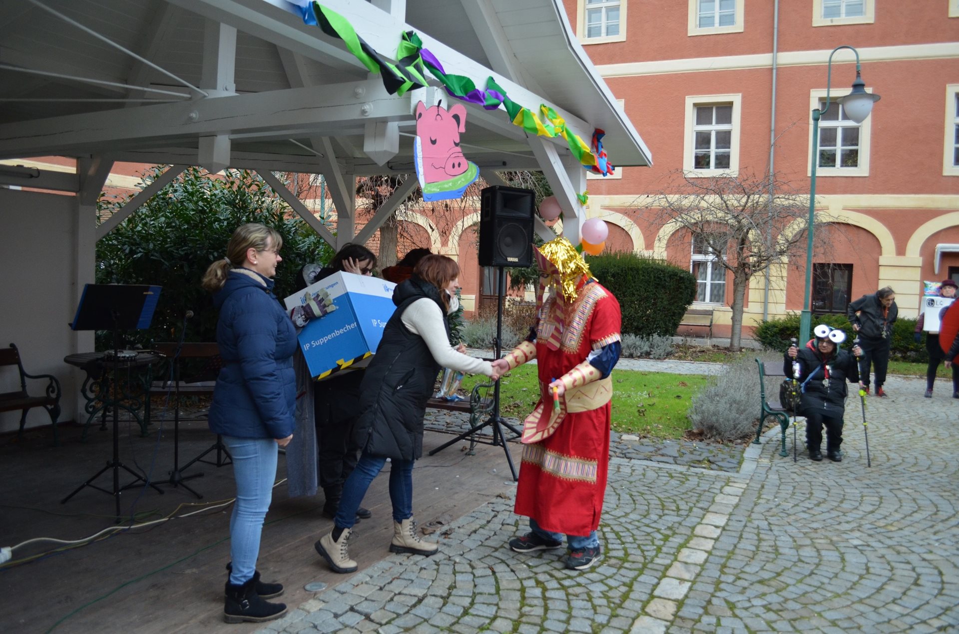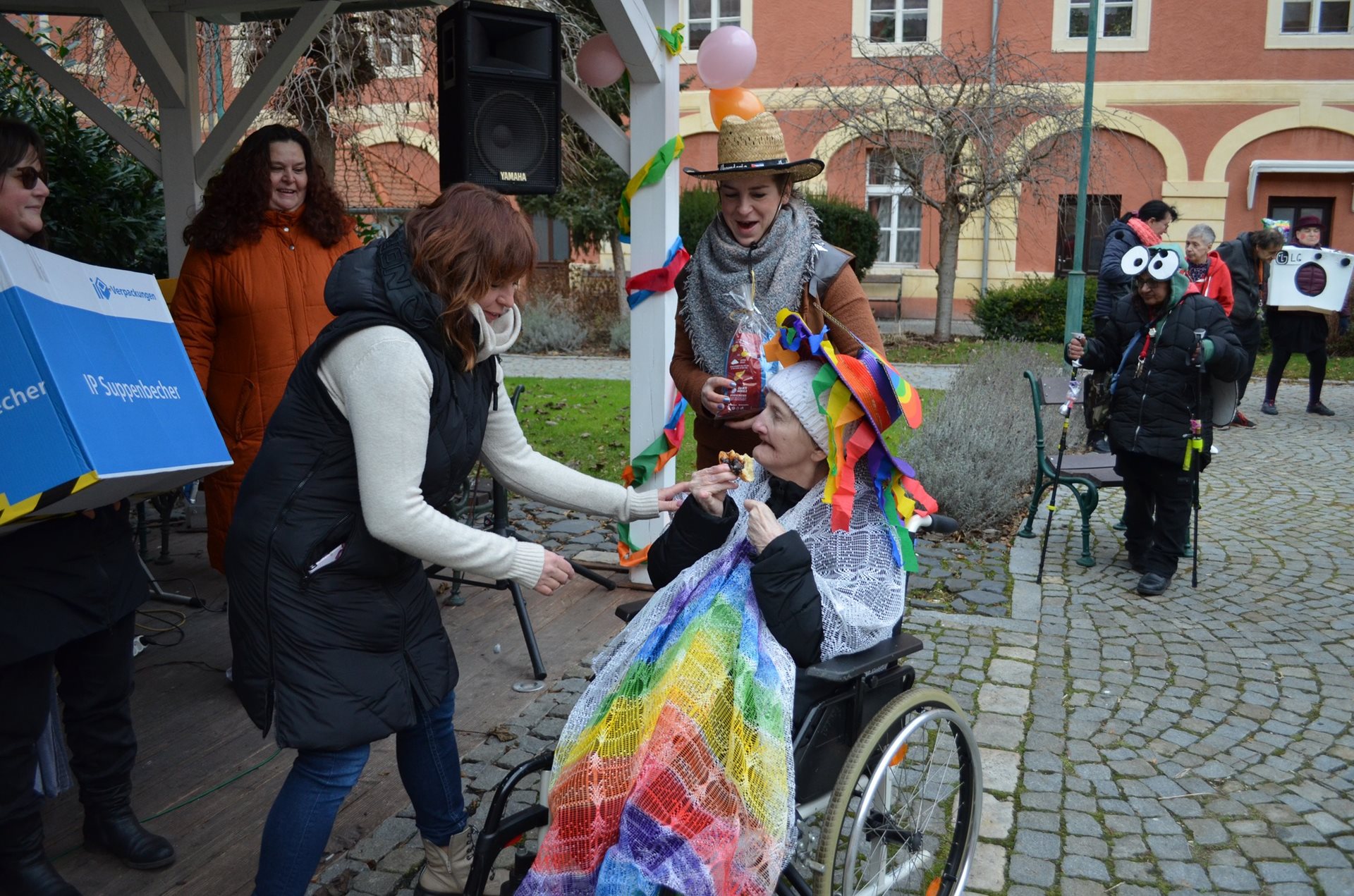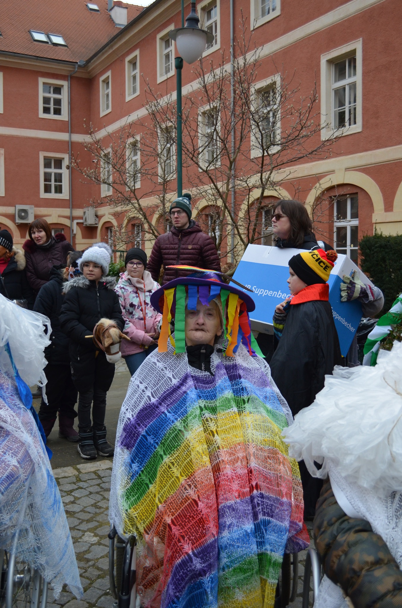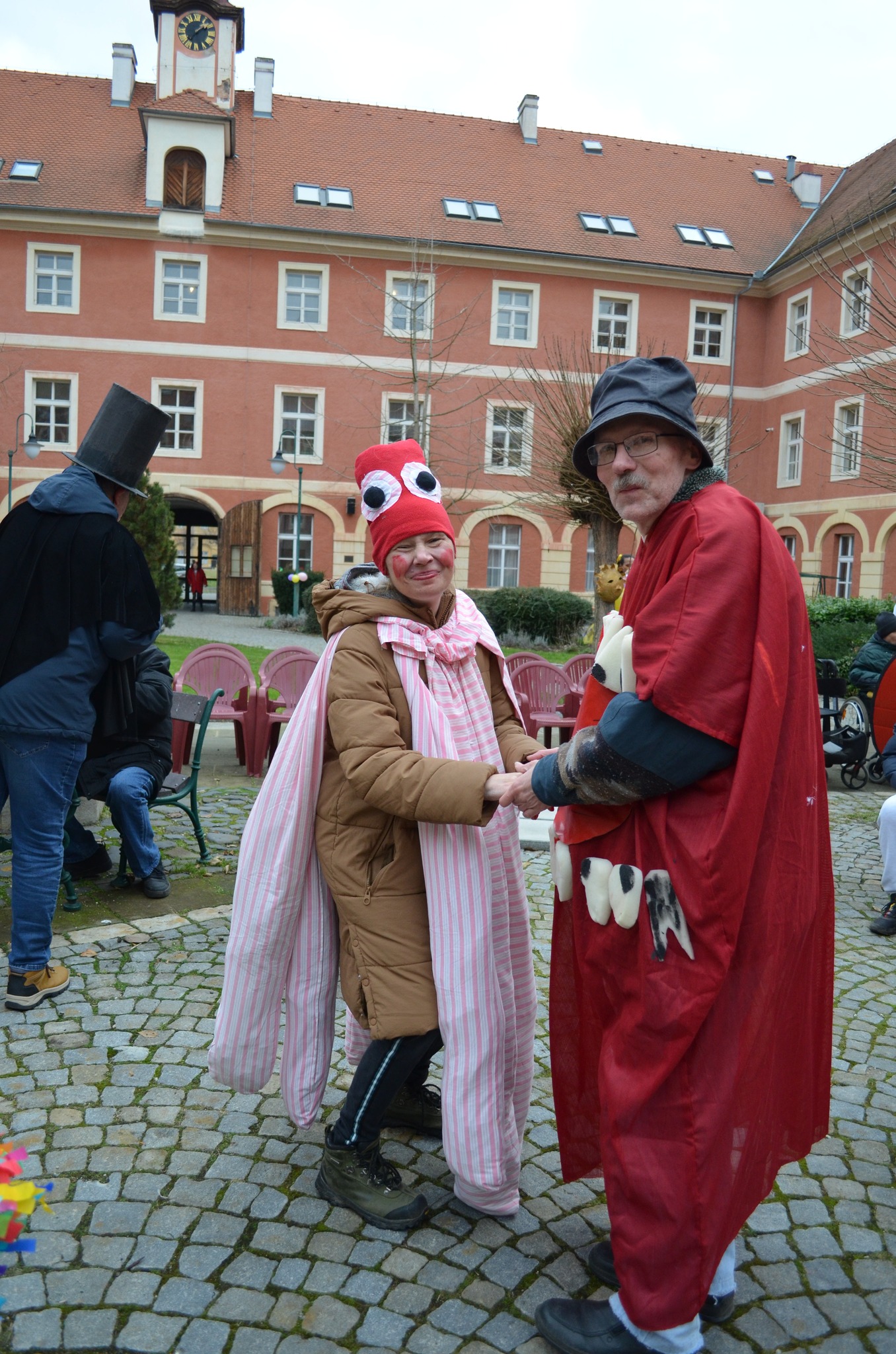 Cílem průvodu, který prošel tradičně kolem náměstí, bylo atrium našeho Domova. Zde proběhlo vyhodnocení nejlepších letošních kostýmů jak z řad uživatel, tak i školáků. Všichni měli možnost ochutnat hot drink a masopustní koláče, které připravila naše kuchyně. Počasí nám přálo a my jsme si masopustního veselí mohli užívat celé dopoledne. Za návštěvu děkujeme pozvaným spolupracujícím organizacím - TMZ